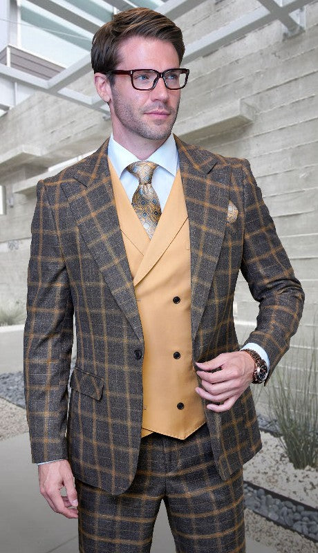 • 3pc Peak Lapel Suit With Solid Color Matching Contrast Vest