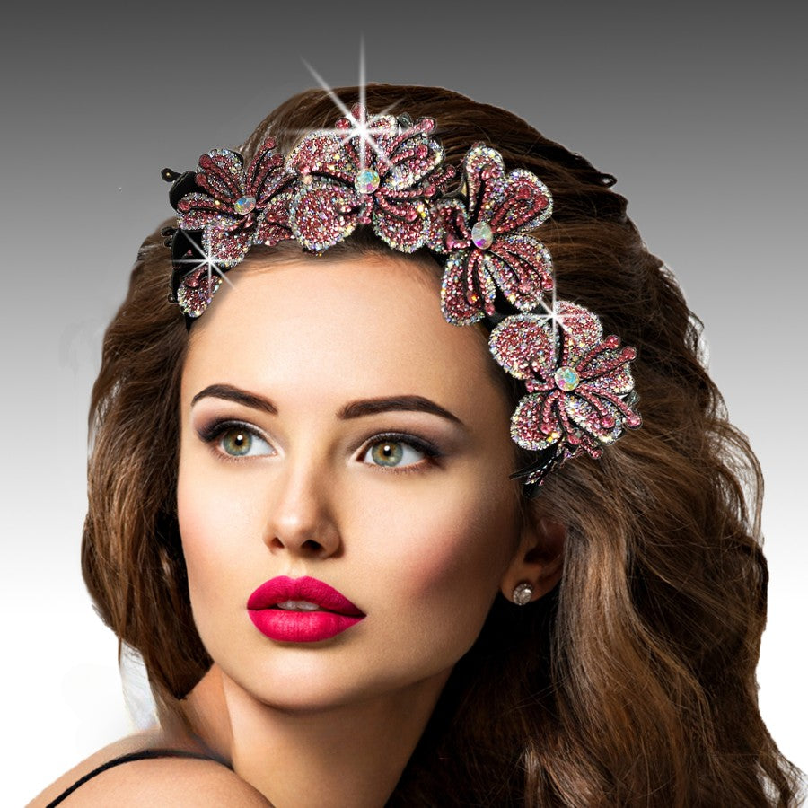 • Crystal Encrusted Flowers Frame A Headband to Create A Simply Elegant and Eye Catching Headpiece