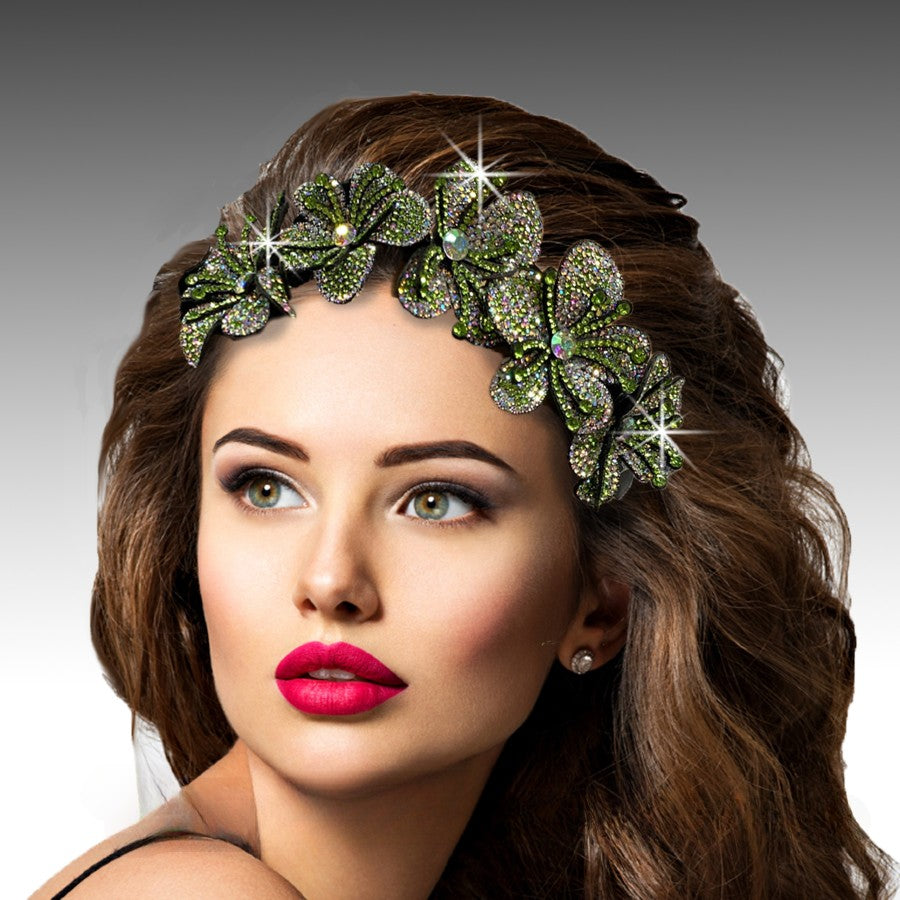 • Crystal Encrusted Flowers Frame A Headband to Create A Simply Elegant and Eye Catching Headpiece
