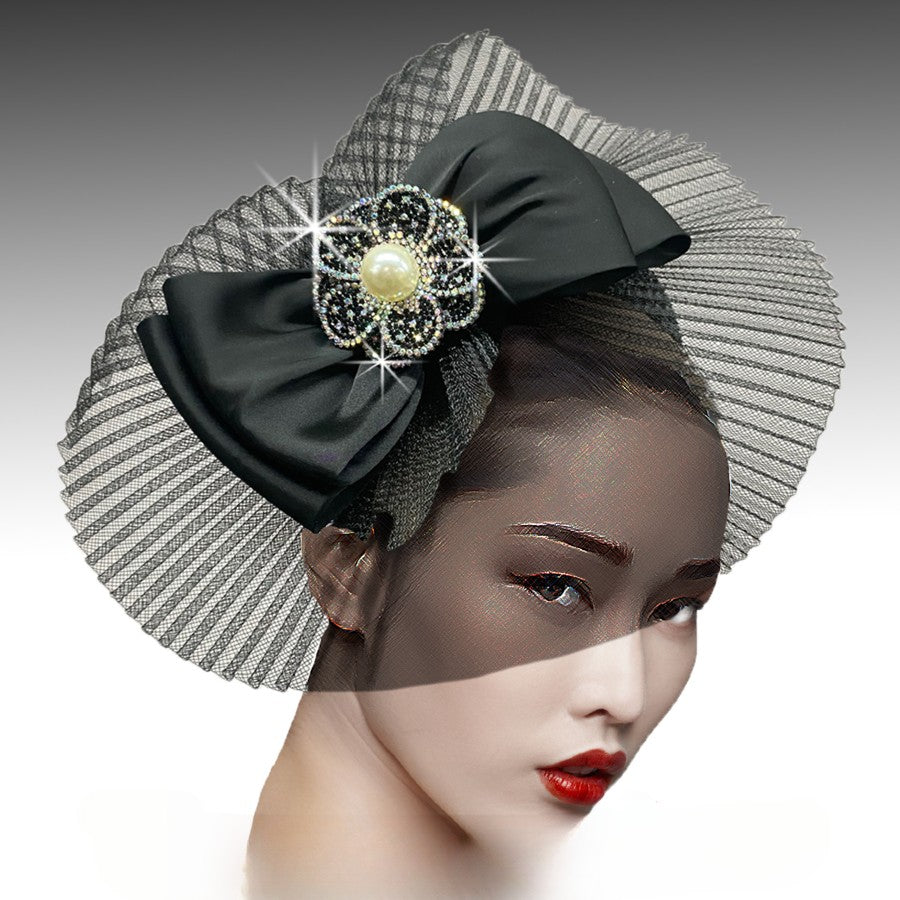 • Fascinator Expertly Folded Bow Rests in the Center And Features a Jewel Blossom