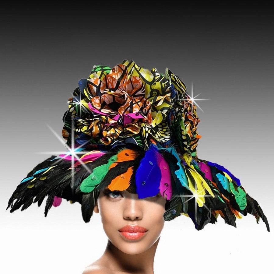 • Multi Colored Feathers on the Brim Create A Nest for the Halo of Flowers Made from Vivid Tribal Fabrics Create Festive Hat