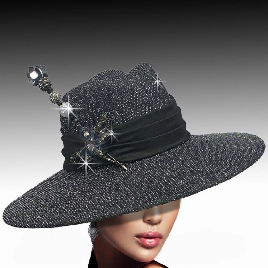 • It is Enveloped in a Coat of Luxurious Stardust And Features a Draped Band And a Multi-jewel Hat Pin