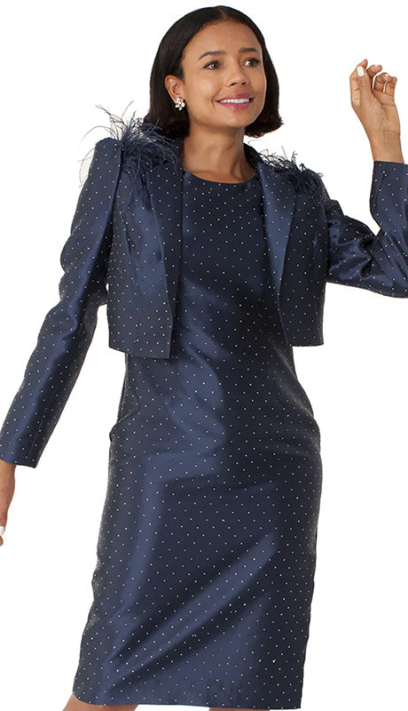 • 2pc Dress And Sleek Jacket Set With Studded Rhinestones In A Polka Dot Design Along with Feathered Shoulders