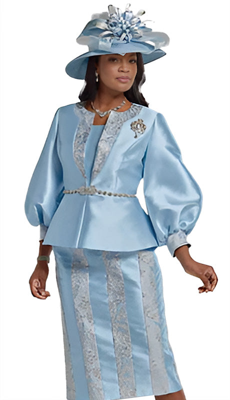 • 3pc Elegant Skirt Suit Featuring Bishop Sleeve Jacket With A Jeweled Brooch