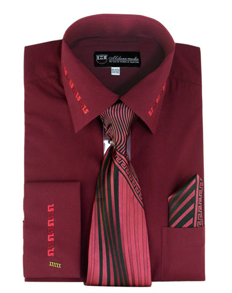 Burgundy ( Matching Tie and Hanky Included, French Cuff, Pattern Collar and Cuff, Mens Dress Shirt )